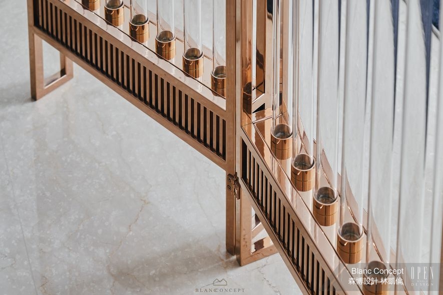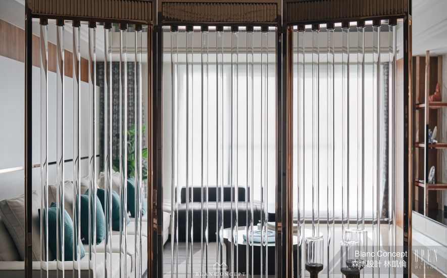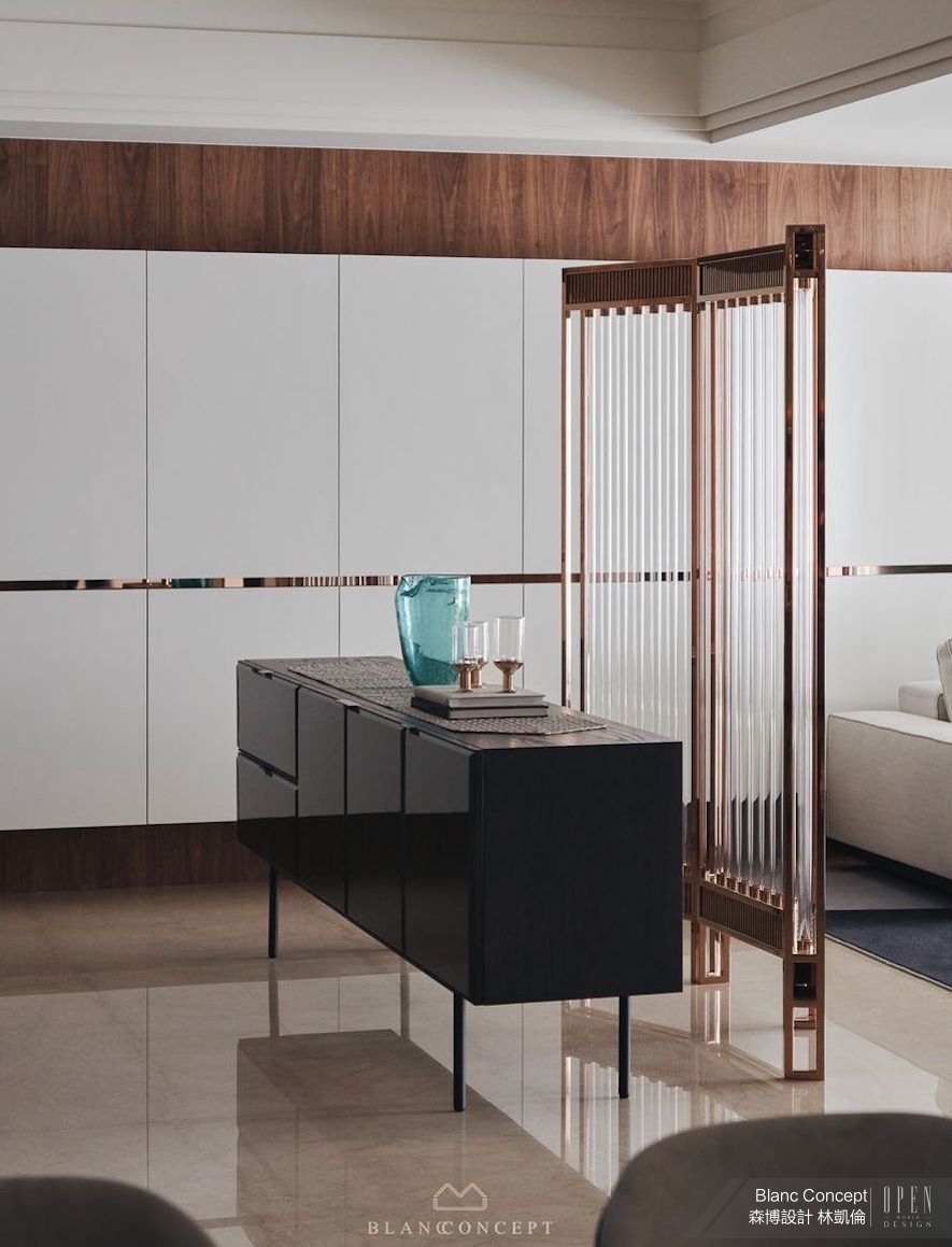推開門,日光穿透落地窗及輕盈屏風推波而來,份量感十足卻不顯突兀地劃分場域,使玄關與起居區機能開門立見;而屏風本身採用鍍鈦鑲嵌玻璃定製而成,一方面作為建築外觀意象的延續,呈現出宛如工藝品的晶瑩質地,另外也成功化解風水上的穿堂煞,並保全起居區域的生活隱私,為設計師首次嘗試的開放式入門規劃博得好評。