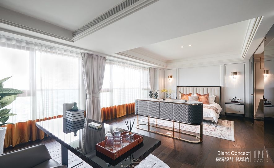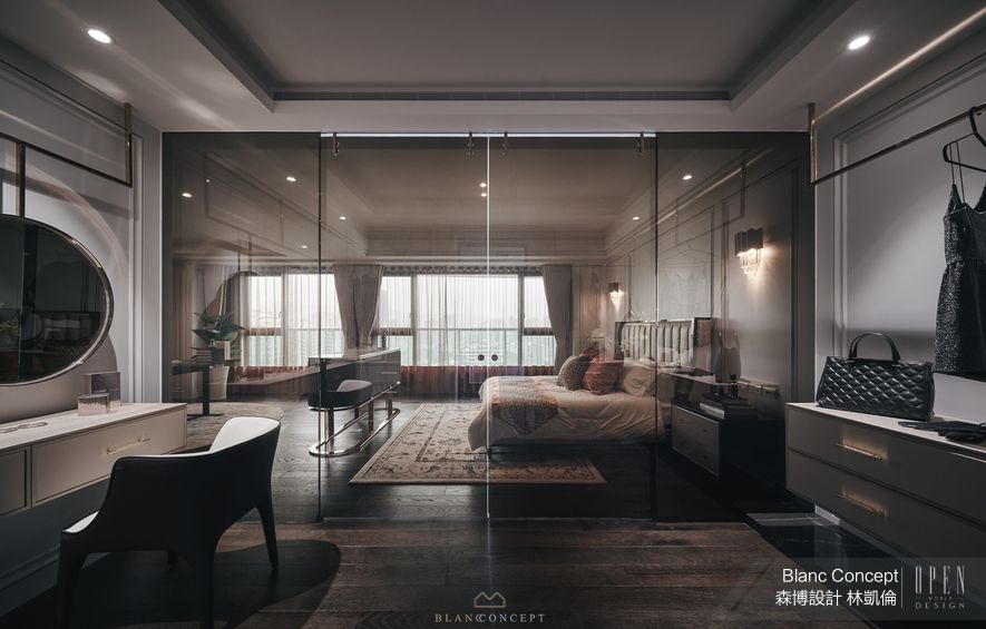 回到主臥室,場域擦除公領域的光艷色澤,全區鋪上沉穩的拼木地坪,並藉由大塊黑玻將主要區塊劃為休憩與更衣場所。在休憩的這一側,落地窗迎來滿地的自然採光,閃耀中央的鍍鈦櫃體,顯示其細部劃分空間感之作用,此外更對應天花板的橫樑位置,確立前方閱覽及後方睡臥的使用機能。