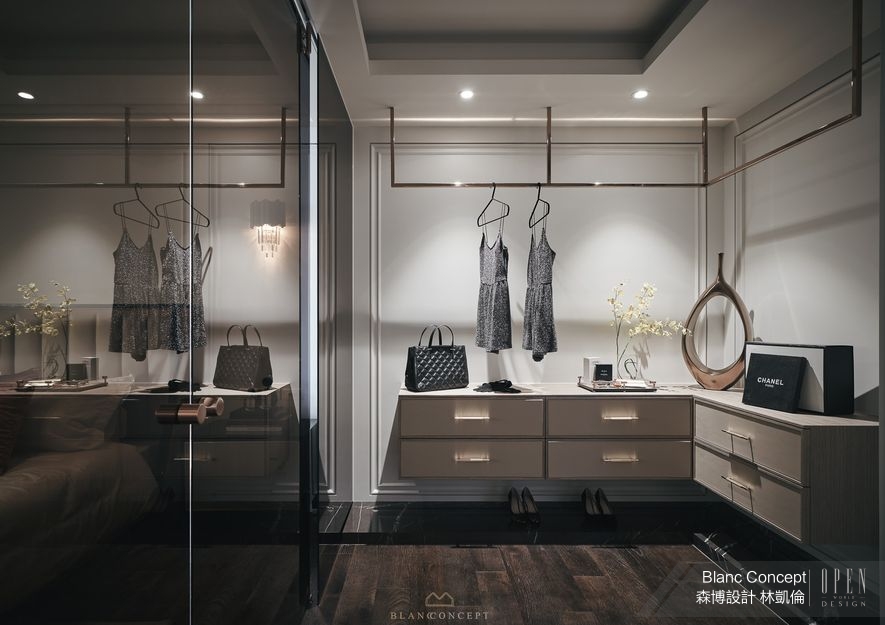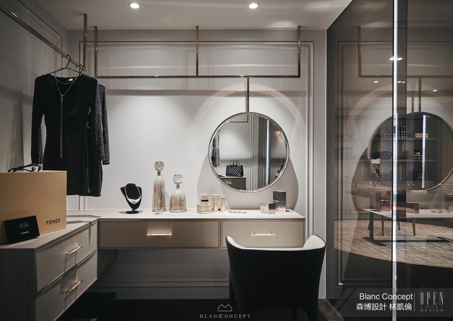 (圖)設計師把精品門市的高貴體驗搬入家中,鍍鈦掛衣架連接懸空圓鏡,呈現出機能與美感的連動展演。