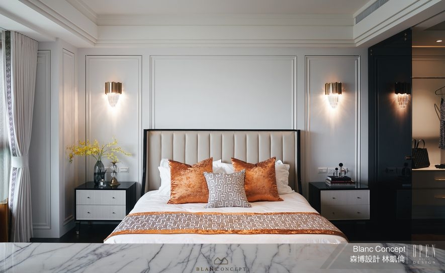 臥床區延展通天的純淨白衣而下,連接搭襯暖橘抱枕的床心,色彩亦引人望向精心特製的紗簾,拼接具有重量感且仍帶溫暖的布質下擺。回到床畔,床板採用淡粉繃布回應被單與地毯等同色系單品,主牆兩側描繪古典意蘊的立面設計,鑲上一對敷灑奢華光粉的壁燈,將繁麗與簡約交融為一幅清透的舒眠氣象。