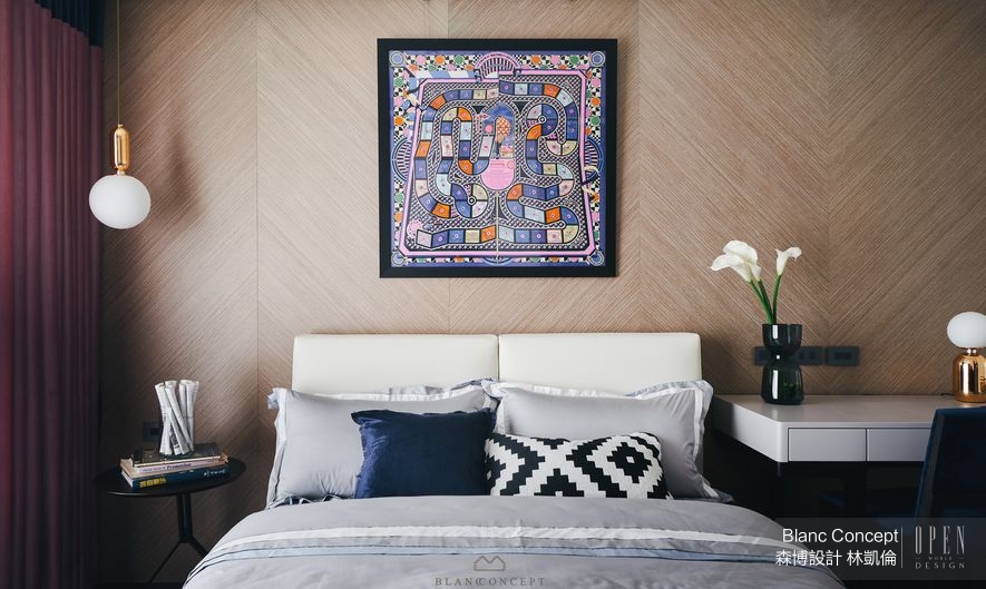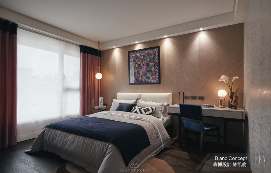 走近面目和煦的次臥室,在簡潔有力的空間架構下,濃厚的靛藍與磚紅軟件編構出醒目的主要色彩,搭襯散發靜謐氣質的木紋主牆,淺淡的人字拼紋理彷彿輕輕刮飾出的手感花紋,承托起床頭的圖騰掛畫及抱枕,將此間睡房梭織為一幅帶有民族風味的經緯空間。而綴亮兩側的鍍鈦燈飾便成為潛藏耀人閃光的金線,延續公領域重點式打亮的設計手法,以及「圓融」的量體精神,扣上串連個別區域主題的重要線索。