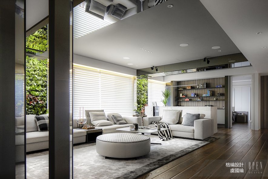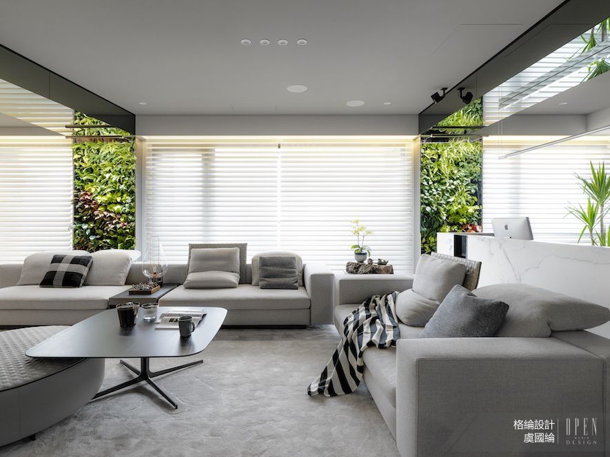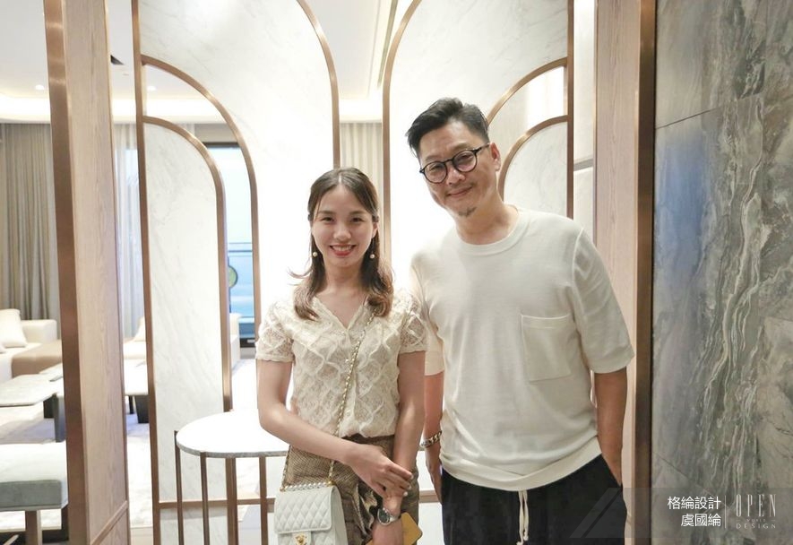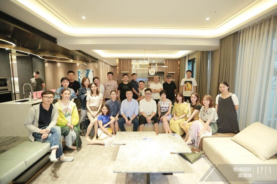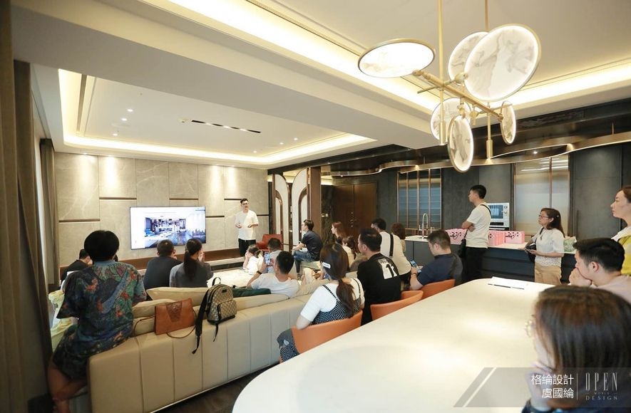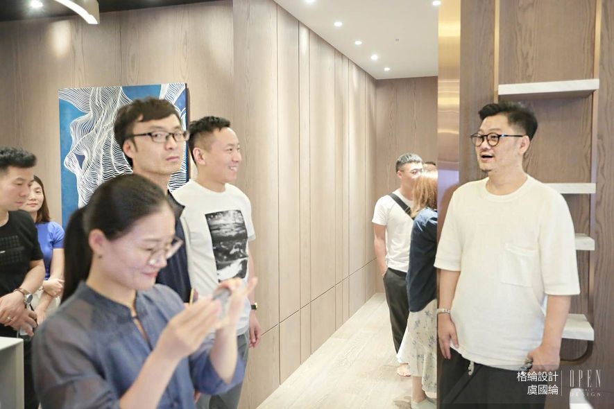 演說結束後,總監接著更直接地以活動所在地——格綸團隊的最新住宅空間為本,帶領隊伍細部觀察質材運用、場域轉換等藝術手法,進行一場開啟感官的深度導覽。依循通透開放的動線前行,簡約架構內舒展的曲型流線平衡視覺,搭配大面積鋪設的雪紋白石材,準確捕捉並呈現出精緻動人的空間質感,在在使人領略虞總監筆下,別於大塊綠意的低奢詮釋。