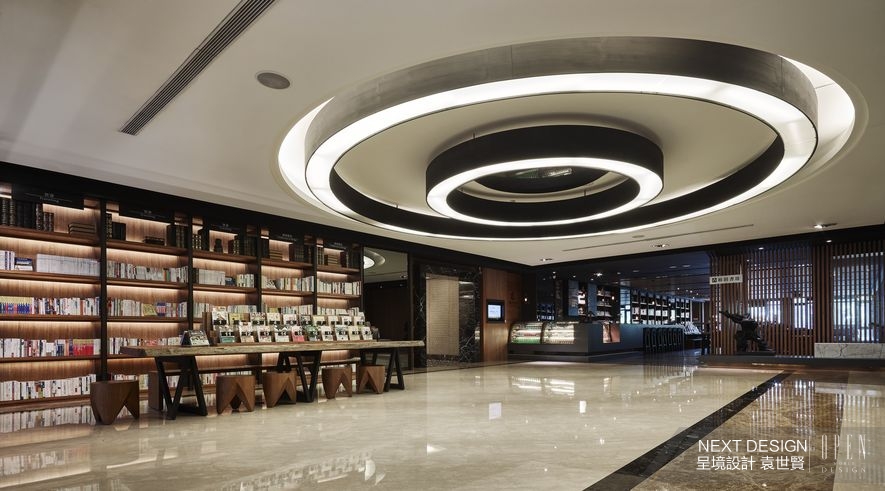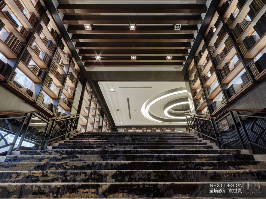 每個故事都需要一個開場,本案以伸向天際的地毯長階作為入場通道,擎天的開放式書架肅立迎接,自然光線滲透霧面玻璃背板,曬暖閒散擺放的書籍與行人腳步。來到迎賓大廳,空間部署一目瞭然地於眼前鋪展,全區採用柔潤的天然大理石,輝映造型主燈投下的溫煦光照,引人注視其醒目而圓融的燈具樣式;至於旁側環繞的齊頂書櫃則透露著夢幻光芒,宛如實現所有愛書人的夢中書房,其數量之多彰顯出別於一般旅宿的空間想像,卻不令人感到突兀,以溫和漸進的設計語調,引領旅人緩緩從現實世界中抽身,沉入句讀間的抽象空間次元。