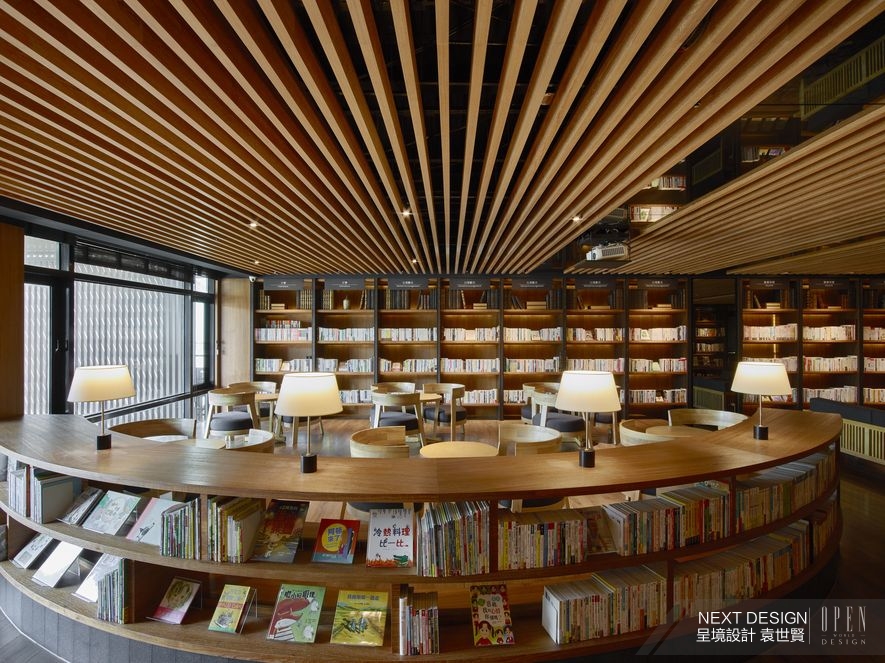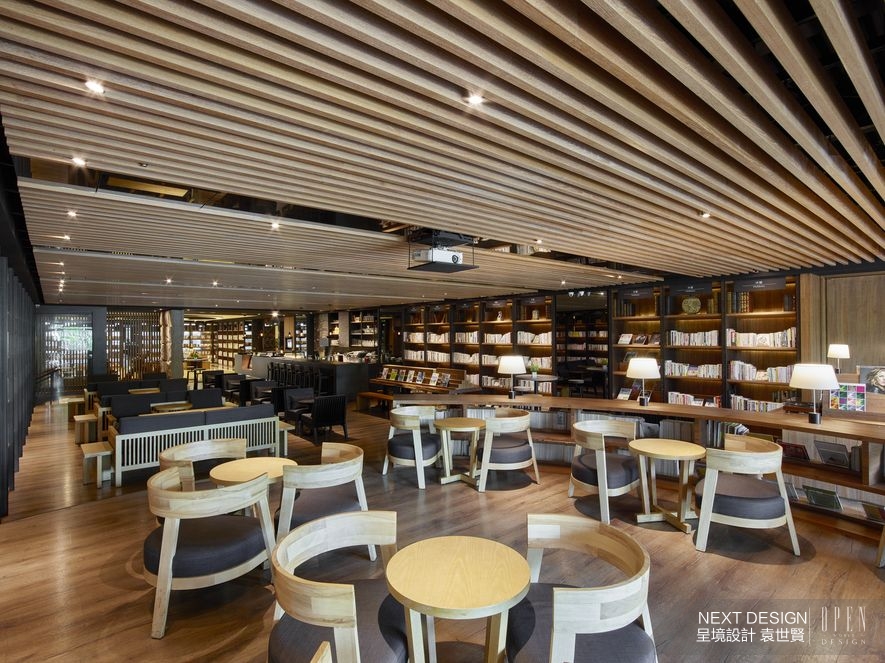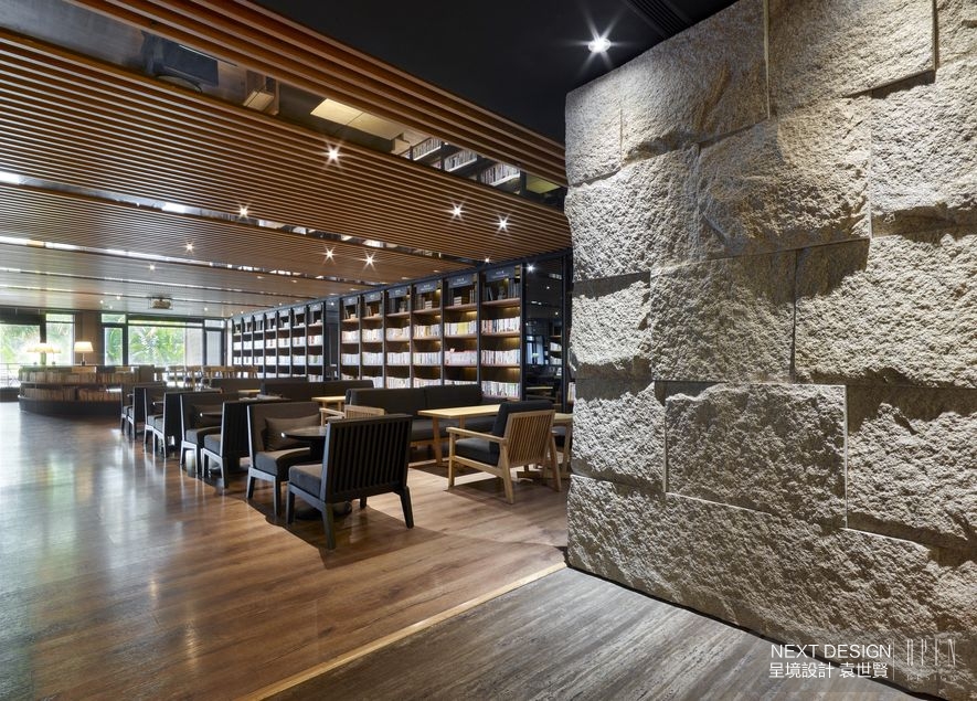與前廳同享一頁的是開放式閱覽區,敞朗佈局從質地粗獷的石牆起始,大篇幅落地窗告終,過程中衍生出和諧的木作天地,格柵形式的天花板嵌上規則排列的灰鏡,延展溫潤視覺同時形塑空間骨架,而支撐軀體的靈魂要件正是「書本」,使得閱覽區即便僅設置簡約桌椅,亦能散發滿室人文溫度。設計師以室內木石搭佐戶外綠意,藉由複合媒材的各異質蘊,由內而外鋪陳出「人造」與「自然」、「冰冷」與「炎熱」等戲劇性變化,使旅客在墜入書海之前,先品味這則空間故事帶來的美感張力。