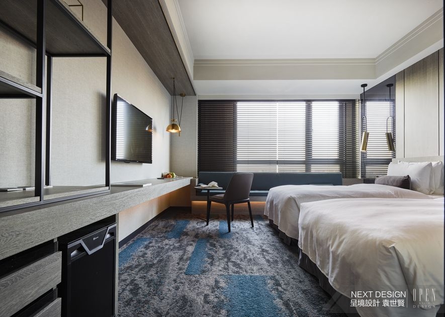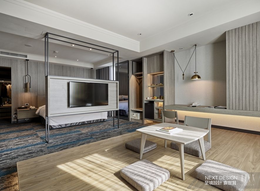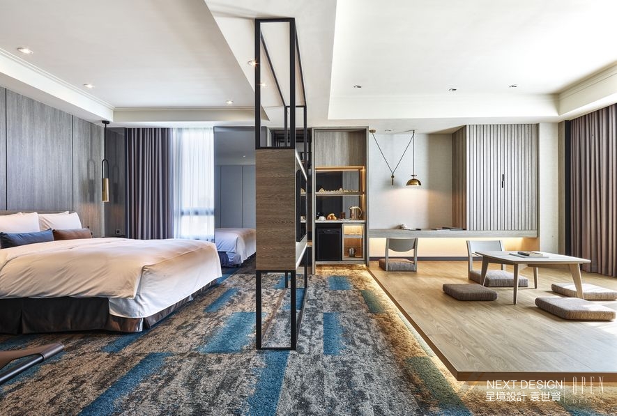 推開房門,腳下的灰藍地毯作為公、私領域的轉場暗示,清爽的獨立世界於焉展開,化繁入簡的線條與清新陳設,讓久擔包袱的肩頸瞬間放鬆。而當央的電視牆脫去體塊束縛,形成寬闊的視線渠道連通室內外景致,其纖細框架更將場域輕盈地一分為二,遠窗處主要滿足臥眠之需,近窗區域則設置加高的和式座席,藉由樸實木質捕捉老城古早的和風記憶,輔以澄黃可愛的間接照明烘托,達成層次鮮明的點睛效果,提供遠道而來的旅人在此慵懶擱置身心。