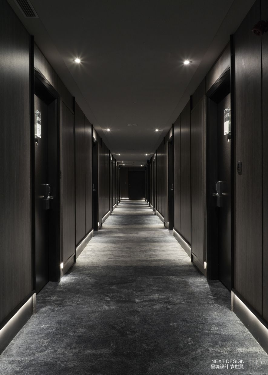 (圖)客房廊道僅於門前設置主要照明,營造出深邃的微光意境,將出返客房的行為轉化為一場通道儀式,暗示即將來臨的全新場域狀態。