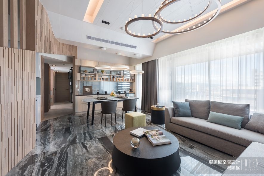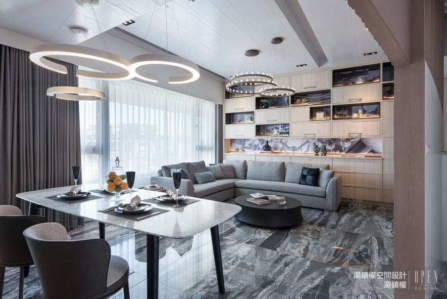 公領域中對比牆體的動態變化,地坪則鋪設較為穩重的石紋磁磚,銜接深色軟件以及晶瑩的環形燈飾,提示情感交流的場域功能。柔亮的日光映照入室,顯現脫去贅飾的天花板與機能櫃體,以包樑挑高及半開放設計共構開闊情景。近身觀察,兩側櫃體藉由清玻和鏤空設計,破解立面阻斷視線的干擾;由舊電視牆改造而來的沙發壁櫃,隱約透露濃淡筆畫映襯地坪紋理,更加深家居的細膩層次。