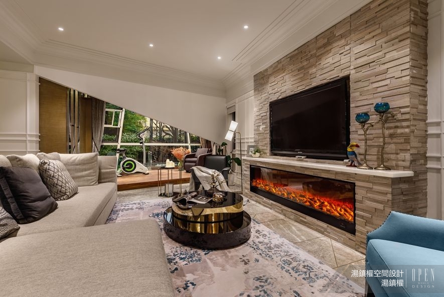 在私宅作品《西郊華城》公領域的簡約天幕下,金碧、窗格、庭園造景,此些散發濃郁東方氣息的設計手法,不僅獲得妥貼運用,展現設計者掌握中式韻味的氣派手筆,更於其巧手中,與火爐、線板、文化石、斜角閣樓等歐風意象完美融混。設計師將前者安排在場域以右,後者則規劃於中央及左側區塊,由右至左依序形成彈性開放的獨立禪室、提供家人圍爐談天的聚會空間,及三面採光且綠景環繞的休憩區域,於風格伴隨機能之間,輕巧為使用者擘開截然不同的場域體驗。