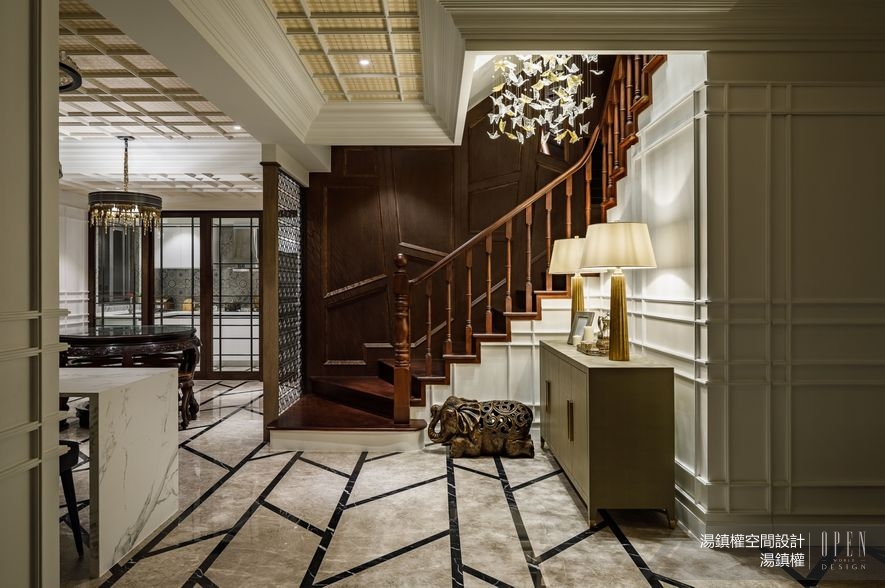 至於銜接樓層的旋梯空間,一方面延續公領域的古典線板,構成色澤清爽的立面,同時與天地的線條樣式隱然產生對話,天花板轉化日式建築的「天井」概念,延展空間的輕柔基底,地坪則透過細膩切割,以黑白石材勾勒竹葉姿態。三者共同鋪展的這片屋景變化,不僅於驚奇中創造和諧視感,更襯托了通往高樓層的木質通道——設計師特別選用穩重大器的木色開展地壁,使邁入私領域前的心緒沉澱,並在複繞上升的行跡中央,設置壯麗的流蘇吊燈,其間有如琉璃含光的蝶影飛舞,愈加增強家居場景莊嚴華貴的生活感受。