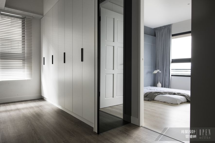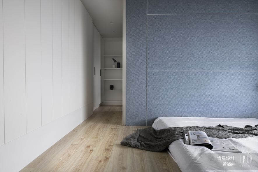 優雅地推開滑門,敞亮的私領域一改起居空間的深厚木質語彙,在純淨天幕與立面環繞下,鋪設清淺的木質地坪提亮環境色調,並悄然轉以藍調為牆——作為場域主題的床頭牆面則運用滿幅壁布襯底,適度裁劃的白色紋脈,對照一側的隱藏櫃及後方開放式層櫃,形塑壁布、木質與鐵件等異材質的精緻對比,娓娓道出專屬舒眠時刻的柔軟細節。