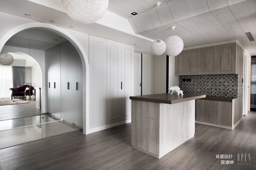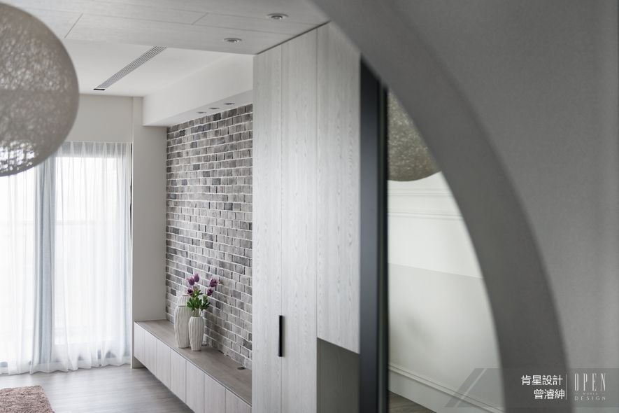 空間柔情自玄關伊始,以拱門及天幕階序為界,清爽地劃分機能區塊,使入門接塵、輕食餐敘與休憩起居各據一處,而三者無隔間的開放式設計,更賦予情感零隔閡的交流通道。