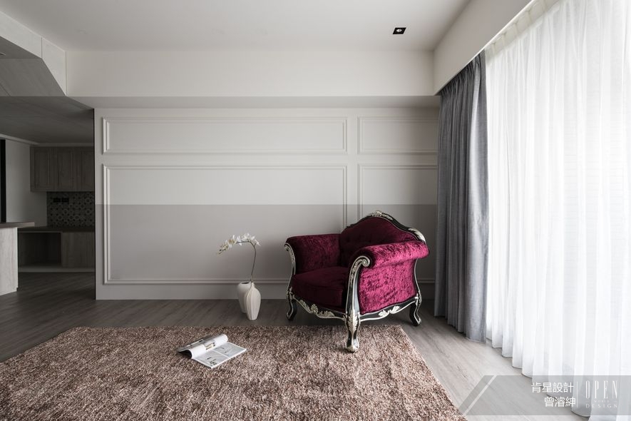 場景由上至下,色度由輕盈白淨沉澱為暖和木質調,形成穩定且和諧的視覺感受之餘,灰階的粗曠文化石電視牆,與溫和的米色木質,亦在靜謐中產生張力;相照對立牆面採用的線板樣式,半身襯以柔軟的卡其漆色,形塑極具鄉村質感的起居空間,並於一隅點綴濃厚的酒紅單椅與短絨地毯,終而完成高貴優雅的生活基調。
