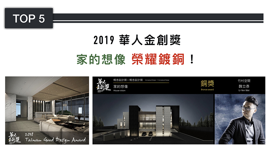 魏立彥總監充分考量業主需求與場地環境限制,完美綜合機能與美觀,打造量體堅實卻視覺輕盈的簡練家宅《家的想像House Vision》,在重視社會與環境責任的華人金創獎,榮獲銅獎讚揚其回應當代「社會設計」的美學,為品牌贏來極富人文精神的大力嘉許!