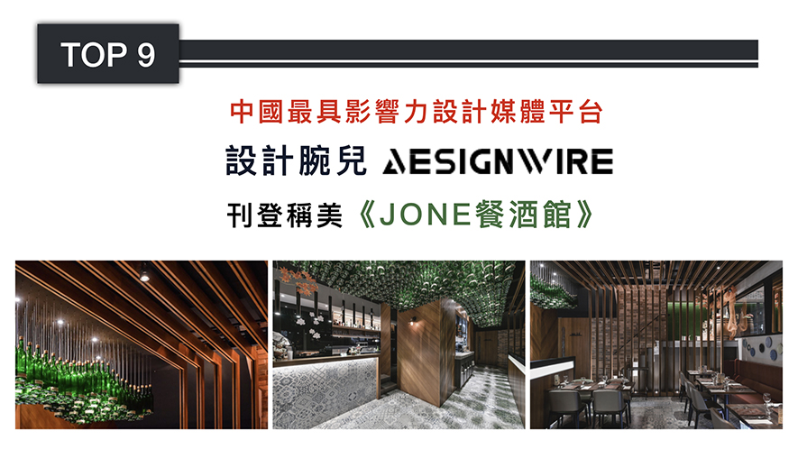 設計類新媒體「設計腕兒」,所刊載的文章平均每篇擁有逾5萬次的瀏覽,最高紀錄更吸引超過75萬人次閱讀,是中國最具影響力與敏銳度的平台。魏立彥總監的《JONE餐酒館》,以台式復古印象混搭歐式餐酒館的神秘與工業風,擘畫出跨越時空界限的風格場域,獲得「設計腕兒」青睞,於2019年4月躍登其下社群平台,大展品牌美學的影響疆域!