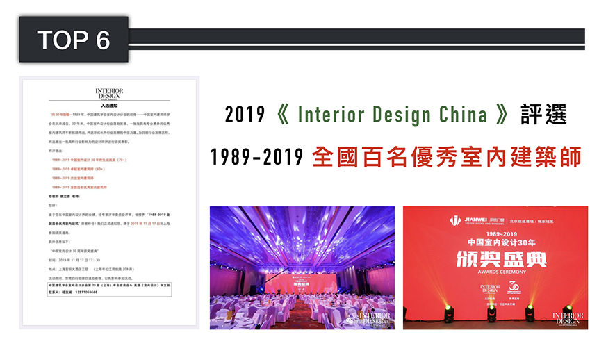 由中國建築裝飾協會主辦的「設計年度大會」,旨在推動建築空間的永續發展,並發掘設計領域中擁有突出貢獻的設計師、設計經營方和學術研究者等。而魏立彥總監憑藉累積的傑出作品,於今年參賽之初便備受大會評審團重視;角逐最終席次時則以作品中大量鑲嵌的「人文精神」、「在地文化」及「設計價值」,拿下「年度精英設計師」之殊榮,為自身品牌再創高點!