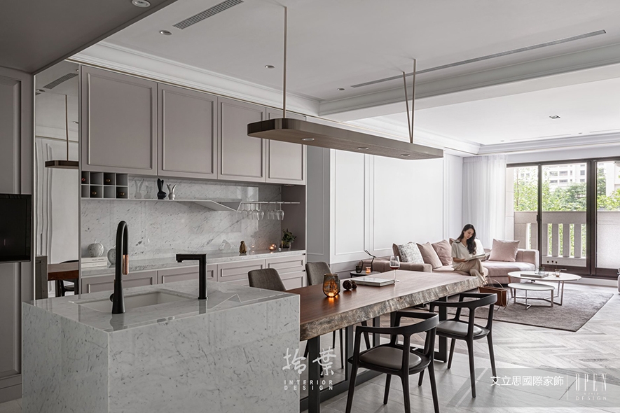 (圖)於較無陽光渲染的餐廳,頂天的藕粉色餐廚櫃,與客廳亮白的主牆比例相當,藉大面積的色彩亮度轉變,襯托空間遞進的層次感,也幫助人們轉換情感思緒。