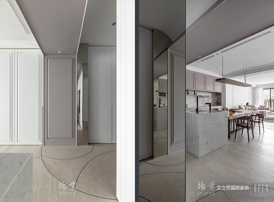 步入屋內,便見直通客廳落地窗的縱深景色,映照於左右兩側的不銹鋼鏡面,讓穿透視感橫向延伸,充分拓展此區的視覺面積,予人豁然開朗之感。仰面上觀,因弧形遮光板而更顯柔和的燈光,將建物大樑的堅硬線條浸染軟化,增添溫婉氛圍;低頭俯視,地坪嵌入的鐵件框架,呈現與上方設計一致的圓弧形貌,兩者相互串連應和,讓人一進門,即能感受婉約而大方的空間個性。
