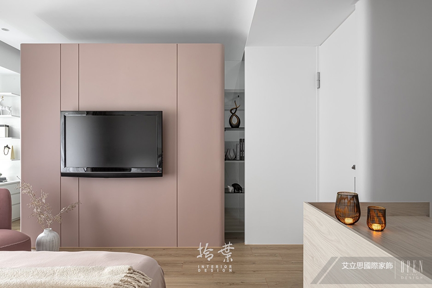 公領域的藕粉色塊,在臥室轉為彩度較飽和的灰粉電視牆,區隔更衣室與床鋪區,形塑沉穩安定的休憩場域,其牆體外層的烤漆以直線分割,既承接整體工整的設計語境,又以不規則的區塊比例褪去生硬,並進一步將牆緣打磨成圓滑弧形,弱化空間稜角,讓屋主的一切感知,無一不溫和舒適,充分療癒一天的
