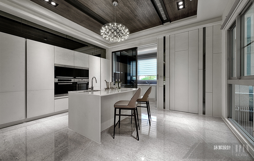 ▲於一片全白色的廚具,與噴漆造型白牆的環繞下,深色實木皮天花的運用,營造區位中的溫潤感,也使得空間表情不致單一乏味。