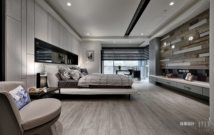 ▲床頭背板使用異色塊拼貼的皮革裱布,而床鋪對面為實木貼皮木板,搭配薄面皮革裱布,齊整縫線更顯質感。