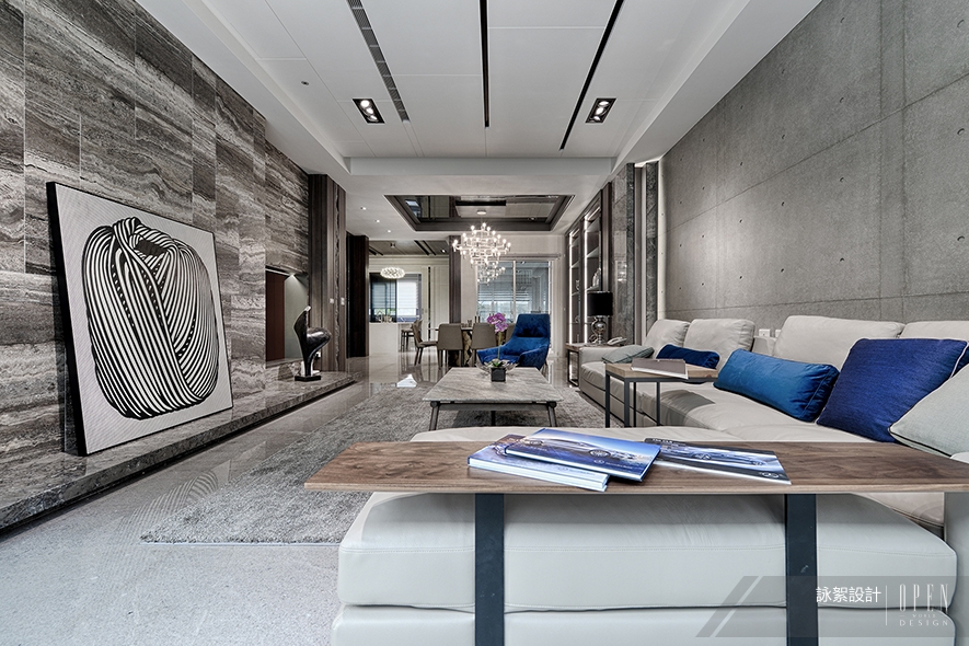 ▲清水模沙發背牆與克羅帝大理石並陳,同時和具備鮮明輪廓、條紋的普羅旺斯大理石相對應,在材質間自在翻玩,創造跳脫框架的飽滿空間肌理。