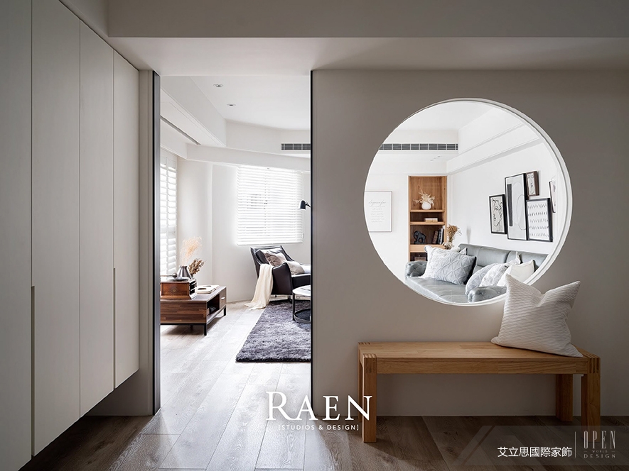 (圖)歸家者於玄關褪去一身疲憊,抬頭一看,隨即透過隔牆的圓窗,望見公領域的美好景緻。