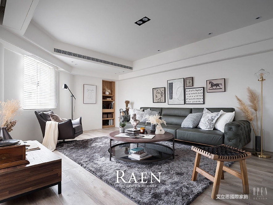明亮淨白揮灑於公領域,歐式藝廊風情呼之欲出,通透的設計手法,使陽光漫溢室內,如同畫框般的圓窗,予以場域視覺放大效果。地坪上的灰調毛絨地毯,延伸至皮革墨綠色沙發,兩者於異材質中碰撞協調韻味,而沙發扶手上極具巧思的金屬釘釦,則隱約透露華美氣質,其後牆面自在鋪展的塗鴉風畫作,更將藝術、慵懶氛圍充分展演。