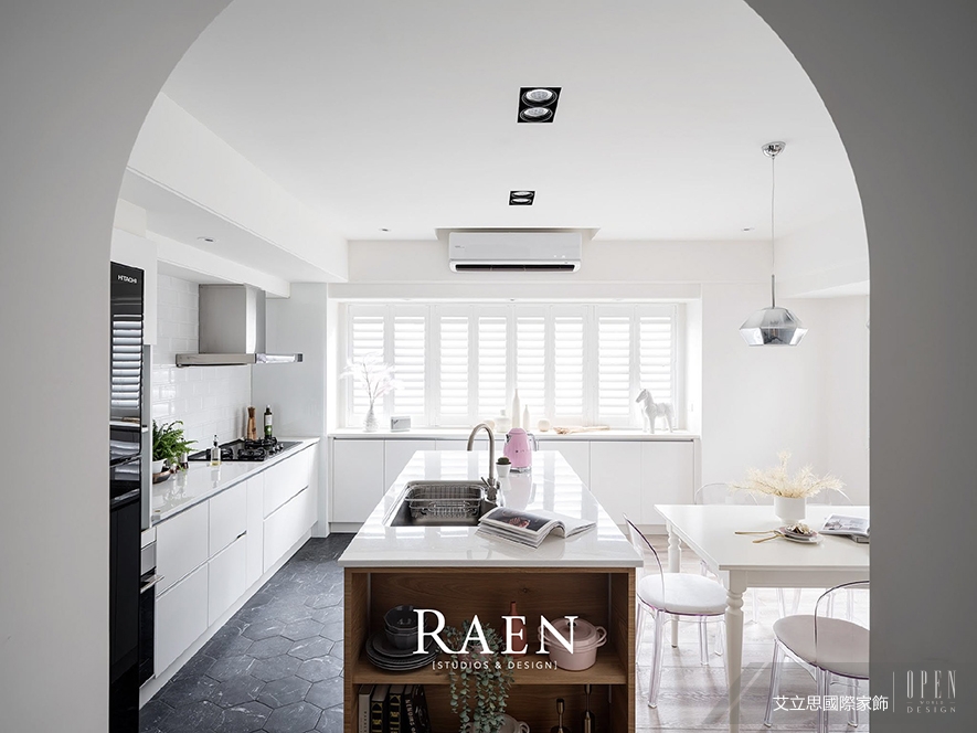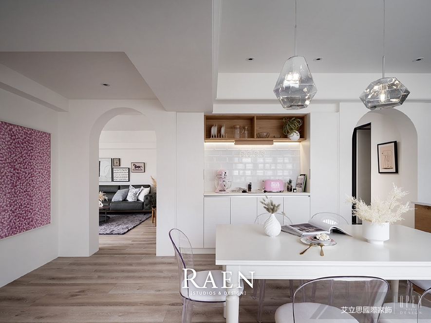 穿過歐風的半圓拱門,入目即是延續客廳白淨色彩主調的餐區,環顧四周,妝點於空間的粉紅藝術畫作及小家電,與予人透明感的餐桌椅,一同表達空間活潑靈活感受;而交織石、木材質的中島,與六角大理石花紋地磚相間的淺色木地坪相映襯,雙雙於質材變化下,顯現特別的肌理層次。