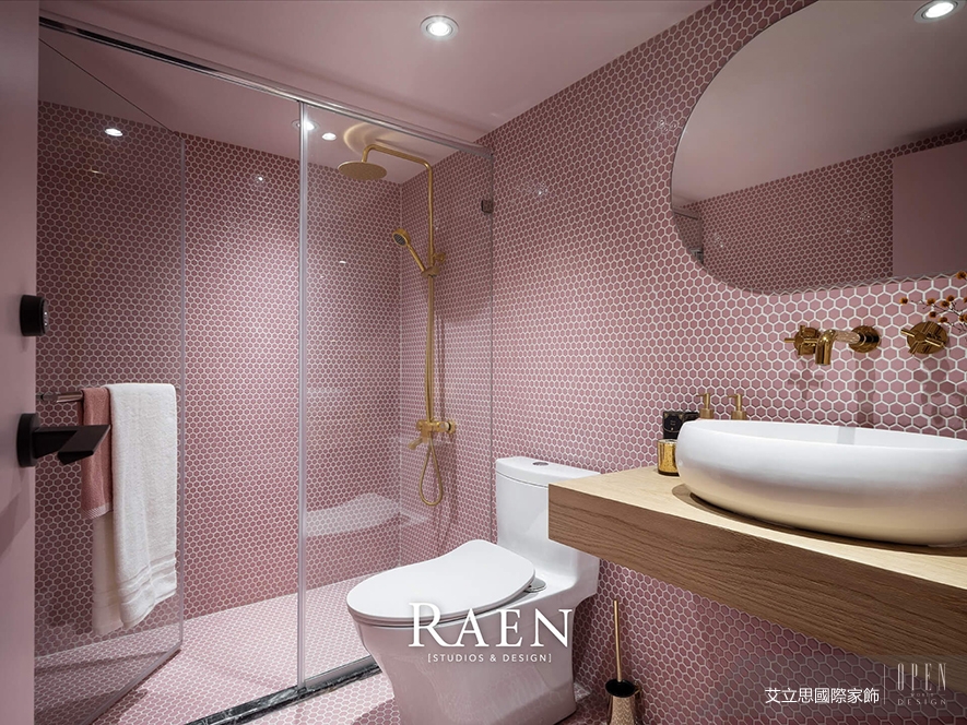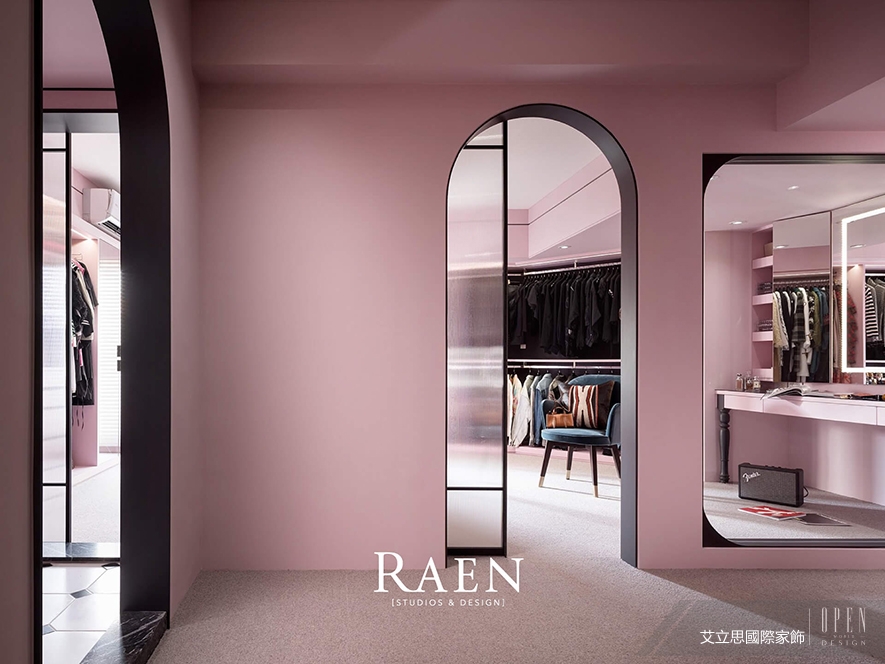 拾階而上,來到高雅迷人的二樓更衣室,五感隨即熏染電影《第凡內早餐》的輕快情緒,女主角奧黛麗.赫本於片中望向櫥窗的經典畫面,以摩登情懷柔美再現。而偌大的空間,流瀉一派粉色情調,引人注目的機能化妝台,則可以適宜轉換完美視角,便於業主於此工作,而一旁的藍綠色絨布化妝椅,予以空間精緻感的同時,也串連色彩的關聯一致性。