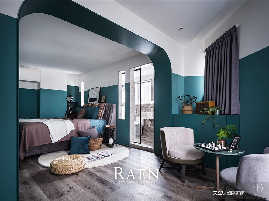 沉穩的飽和色調綿延,私領域於藍綠漆料塗抹下,配搭角落抹茶綠皮紋的單椅,以及橄欖綠大理石桌,除了延續整體的亮彩面貌,也增添場域的趣味性;而床鋪旁不一致的造型床頭燈,則形塑英倫復古風潮的韻致。