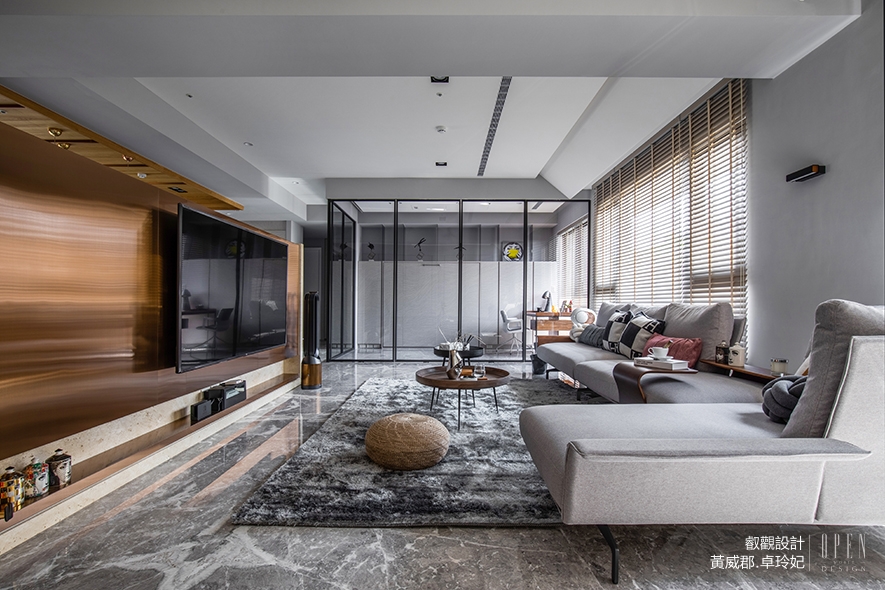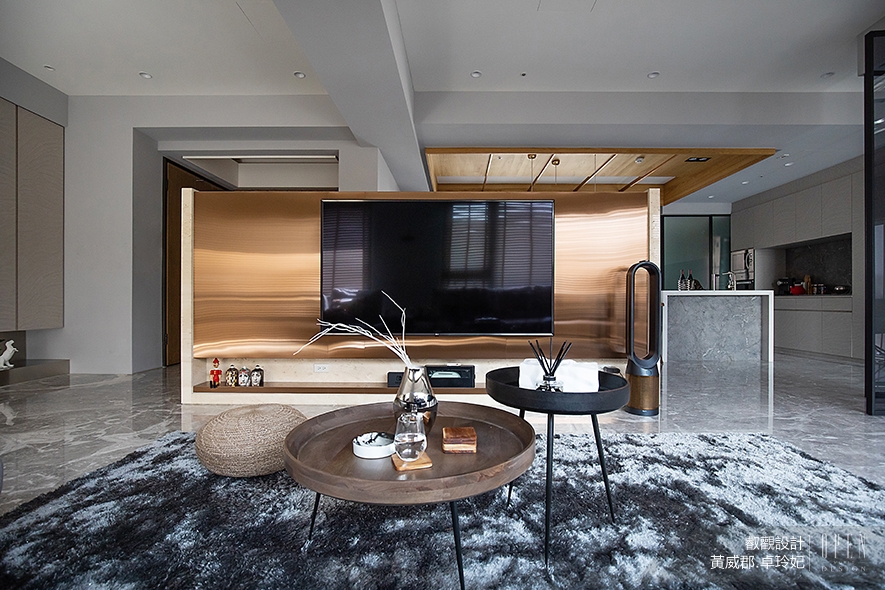 而空間中的最大亮點,便是橫豎於公領域的大片電視主牆,
