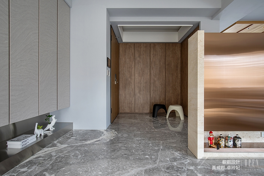 將牆面轉化為櫃體,在沉穩色調下,以材質來做變化,
