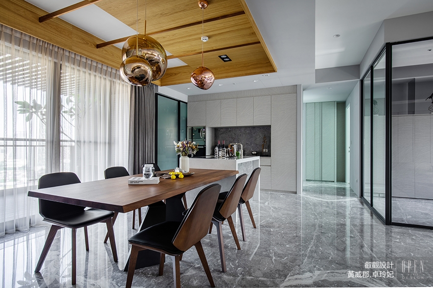 View along the beam and column of the ceiling, all the way to the dining area. The ceiling makes use of different materials yet similar hue to show the distinct spatial character. In addition, retrofit titanium brackets guide to the spacious landscape balcony at the rear. Once again, stack the gradation highlighting the spatial positioning.