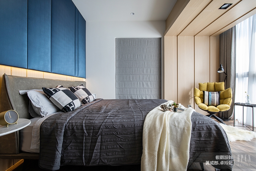 床頭背板的普魯士藍,與臨窗處的暖黃單椅,也為整體氛圍增添活潑色彩。