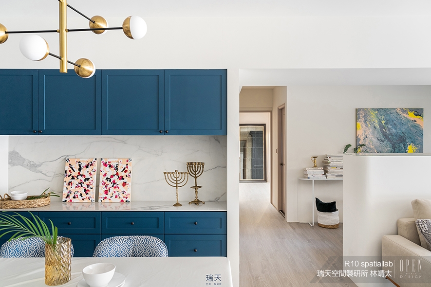 淨白的場域基底,一座深藍色櫃體鮮明地躍入眼簾,而周圍同色系的畫作、餐椅,則仿若這片汪洋向外擴散的點點漣漪,一同為家宅沾染上活潑氣息。「作品《C′est Si Bon!》的女主人,在和我們洽談前就做了許多功課,非常注重生活品質和細節。」因應此個性,林總監一反許多人「以客廳為主」的思維,特地挑選造型、色系皆十分低調的沙發,讓業主喜愛的海軍藍,於一旁餐廚區成為最吸睛的特點,加之金色燈飾點亮背景,完成一幅乾淨又層次分明的優雅景緻。