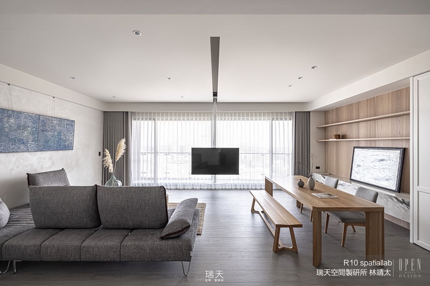 (圖)瑞天近期的新作品《高雄|何宅》,以充滿自然質感的家具,搭配灰階沙發,表露寧靜祥和的侘寂之美。