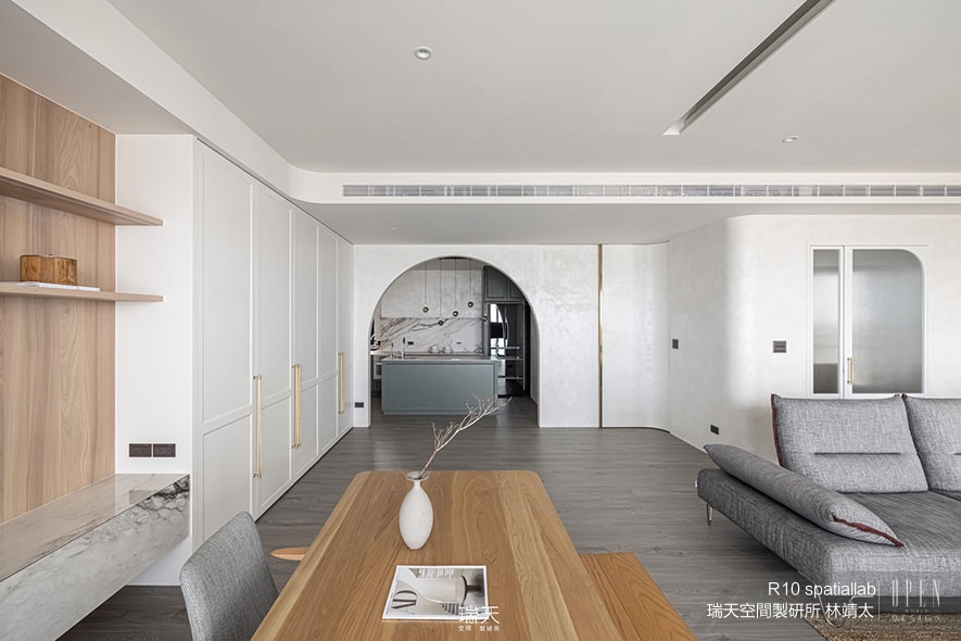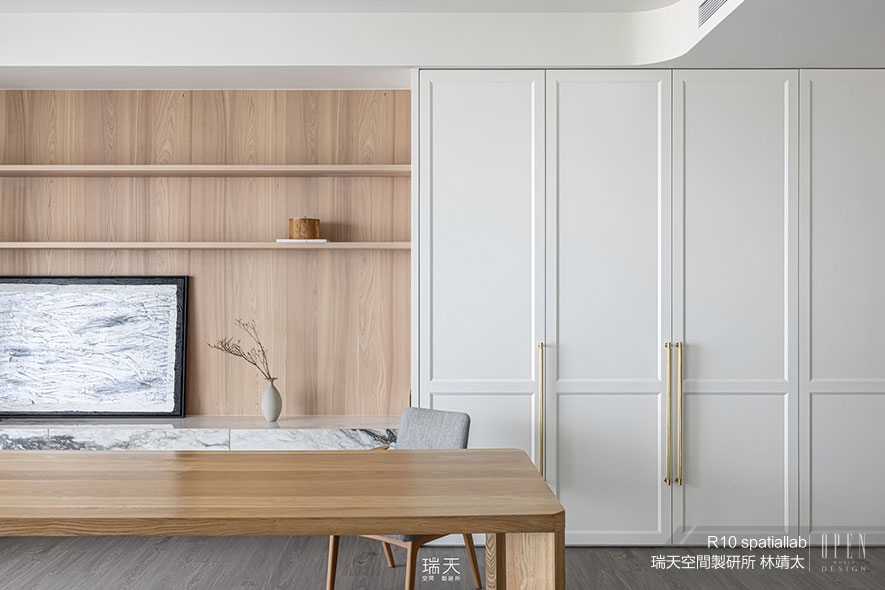 疏密有致的軟裝佈置周圍,瑞天特色的中性美式基調,則保留於櫃體門片的框線、弧形拱門等地,讓予人精緻典雅印象的西方設計語彙,與簡樸的日系家具巧妙互補,產生新穎的和諧感受,「就算是不同風格的元素,只要掌握好比例原則,評估其協調性,放在一起也會感覺很舒適,」總監揭開其中的設計秘訣,「我自己很喜歡這種混搭的效果,目前也持續在嘗試、挑戰。」