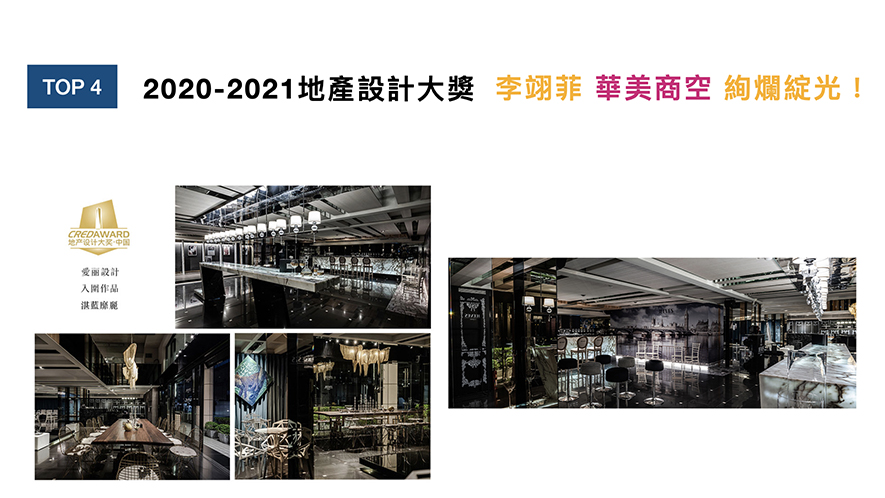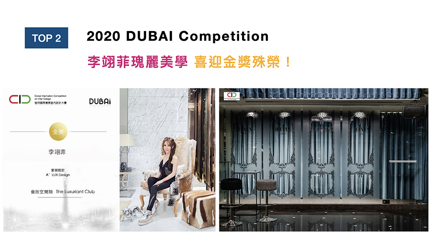 「杜拜國際專業室內設計大賽」由中華文化促進會,以及中東專業室內設計師協會聯合主辦,並以特色BEST TO BEST大獎,吸引設計師相爭角逐。李總監在作品《湛藍靡麗》中,打造出一座兼具時尚質感與複合機能的私人會所,最終奪得「金獎」榮耀!