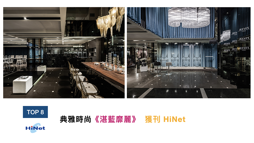 用途於交誼、藝術新品發表等多元活動的作品《湛藍靡麗》,愛丽設計A’LUX Design運用沉浸感十足的場景包裝,水晶等華麗軟裝配置,予以一派華貴氣勢,並也得到「HiNet」推薦曝光!