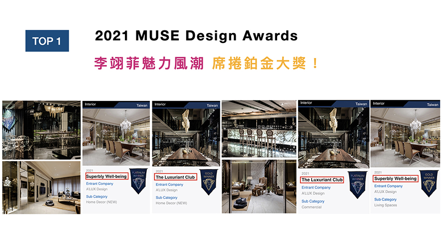 MUSE Design Awards以發掘全球設計繆思為宗旨,為建築、室內、時尚等領域提供全面的發光舞台,每年嚴格的評分標準,吸引國際知名品牌與設計師爭相參與。李總監以高雅細膩如精品飯店的住宅《靚麗采瑩》,拿下「家居裝飾類」鉑金獎與「居住空間類」金獎;私人會所《湛藍靡麗》則豪奪「商業空間類」鉑金獎與「家居裝飾類」金獎!