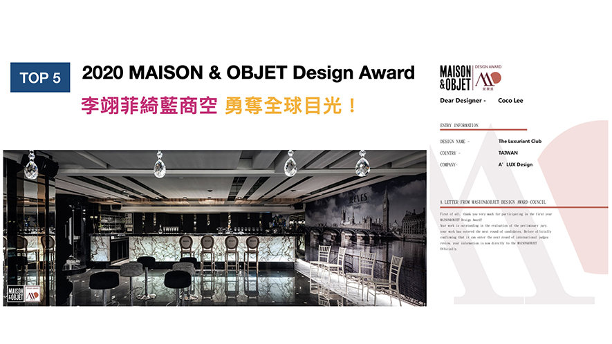 世界三大家具展會之一的MAISON&OBJET PARIS巴黎時尚家居設計展,於1995年創辦,其設立MAISON&OBJET Design Award(美奧獎),旨在「發掘好設計,創造好生活」。愛丽設計A’LUX Design在《湛藍靡麗》一作以亮麗鏡面與水晶裝點,雍容大氣的設計,榮獲2020 MAISON&OBJET Design Award 評審的青睞!