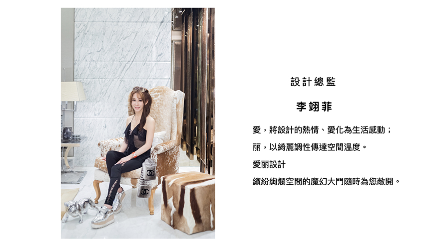 愛丽設計A’LUX Design 李翊菲 設計總監 將設計的熱情、愛化為生活感動,並以綺麗調性傳達空間溫度,在她的設計裡,看到的不僅是硬軟裝的絢麗展現,還有懷抱完成業主夢想藍圖的本心,期待未來,更多魅力作品的露出!