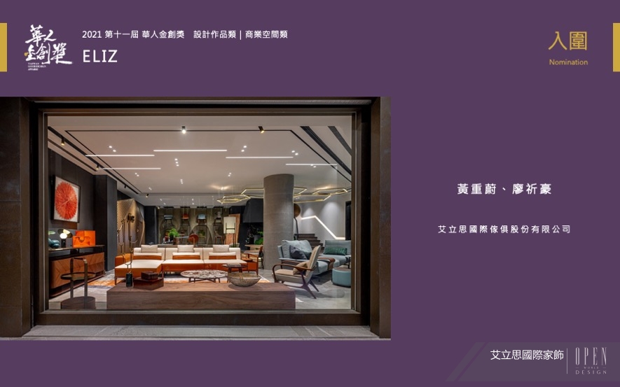 新澄設計 黃重蔚 設計總監 與 Eliz Furniture艾立思國際家飾,聯手於台中精華地段,打造具備「精品飯店」形象的高級家具旗艦店《ELIZ》,以優雅非凡的樣貌,吸引一席評審目光,於「商業空間類」項目大獲好評!