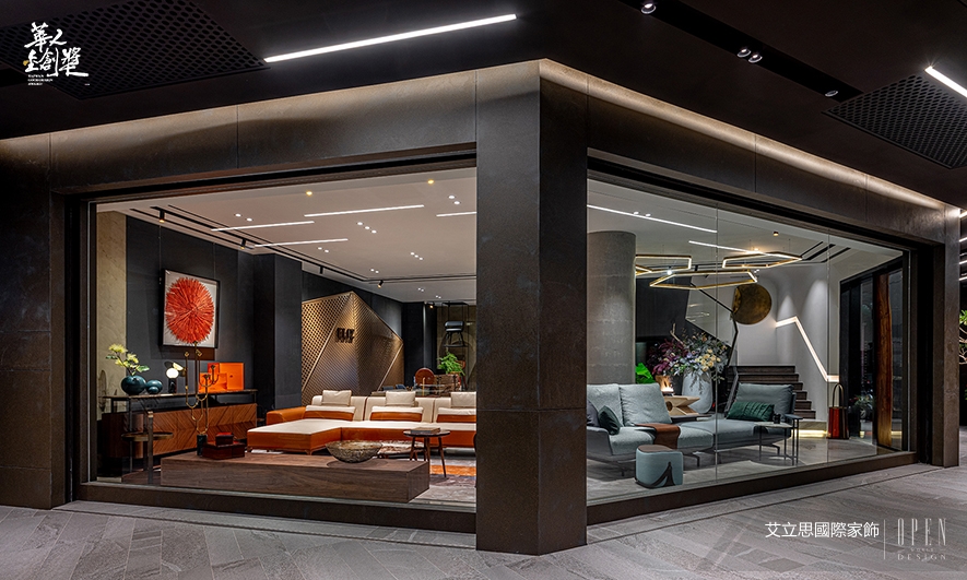 ▲一樓展示區同為店舖的門面,因此其三面外牆皆開大片落地窗,內部陳設的精美進口沙發,除展現品牌氣度外,也特別選擇不易相互遮擋的低背造型,維持畫面的通透敞亮。