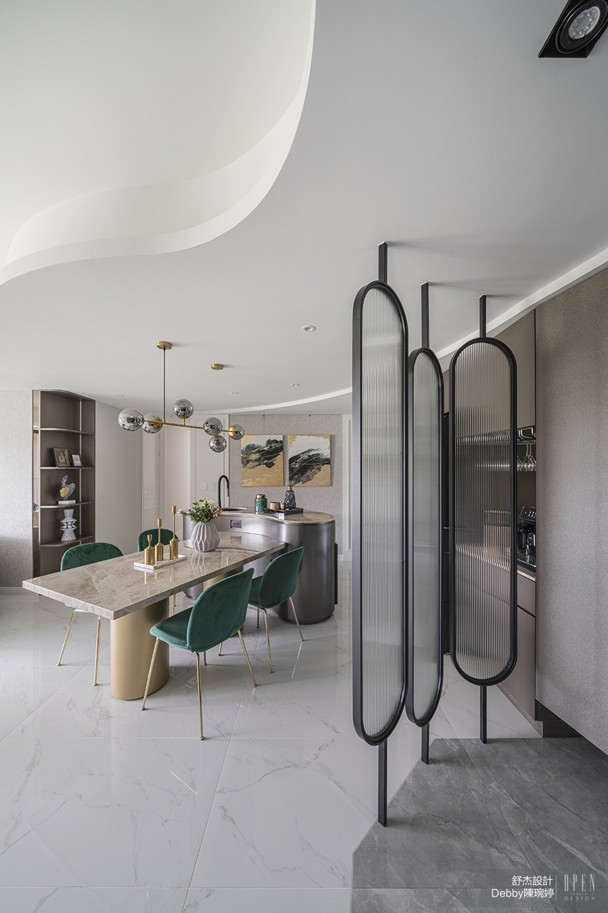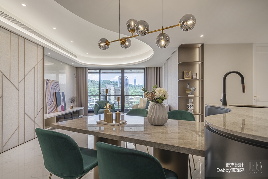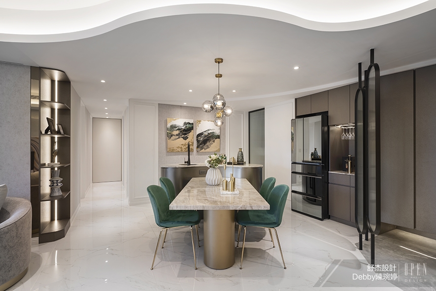 唯美曲線描摹中島吧台造型,金屬質感與周遭深色櫃體並陳,呈現華美深淺層次;紋路調性溫暖、帶棕褐的大理石桌面,搭配祖母綠餐椅,形塑亮眼畫面,晶瑩點亮一家的用餐時光。