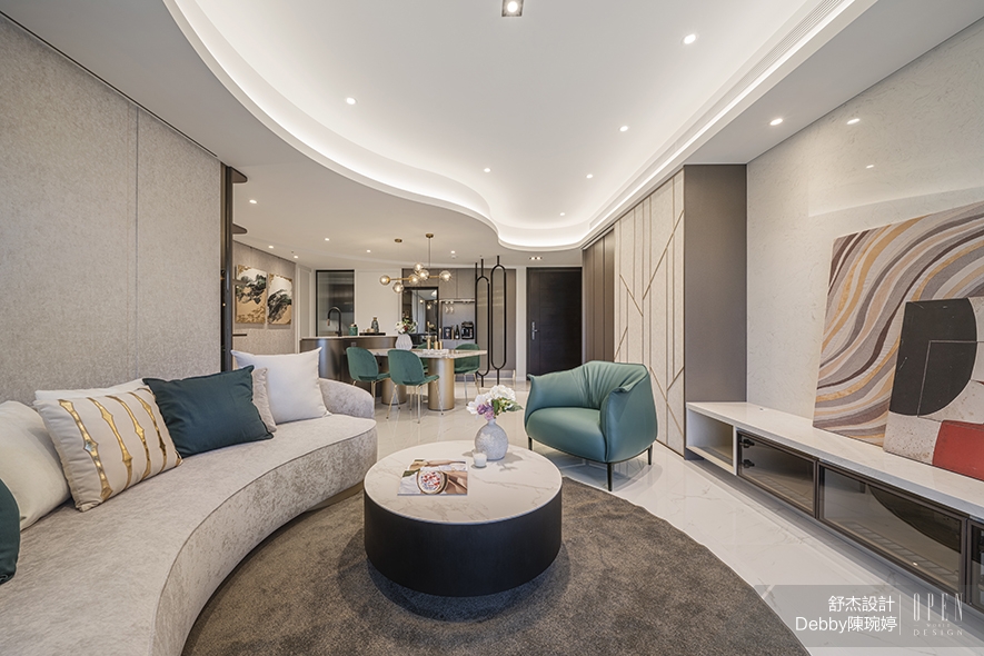 展開溫暖懷抱的弧形沙發,與曲線天花相互呼應,柔順牽引迷人休憩區位,沙發牆利用空間深度,形塑為雙向的櫃面,並擺放業主珍視的回憶物品,而櫃體一旁的茶鏡,則回應環境色系,延伸展示櫃的視覺效果,於閒適的情懷中,悄悄織入藝術品味。