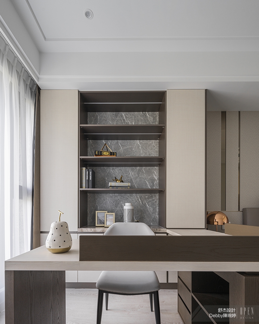 (圖)書櫃造型以深淺跳色,以及灰色白紋,構築櫃體樣貌的層次交響;考量經常會收放物品、增添耐用性,櫃面使用與餐廳中島同樣的暖調石材。