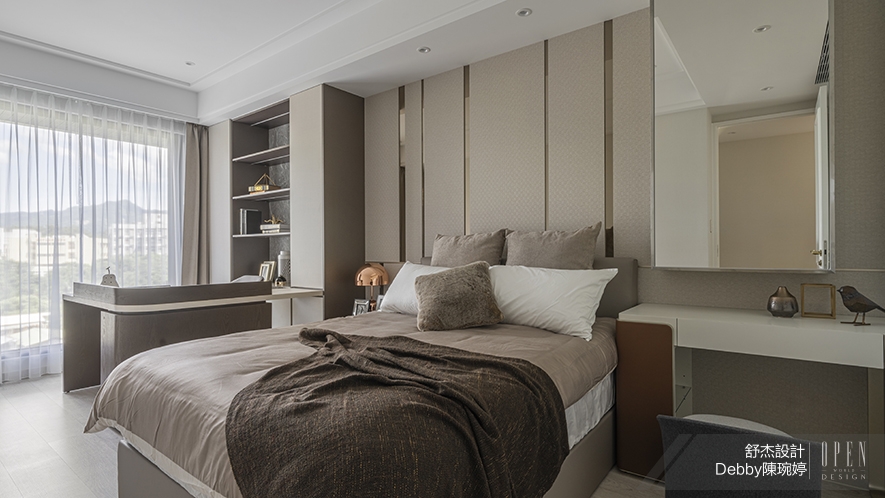 暖褐色基調的主臥室,床頭立面利用錯落設置的茶鏡,形成視覺的多層表現,與書房連貫的此空間,將睡臥區身兼男主人辦公用途,結合中性穩重和舒緩沉靜氛圍,無論專心事務或是沉澱入眠,皆能運用得宜。