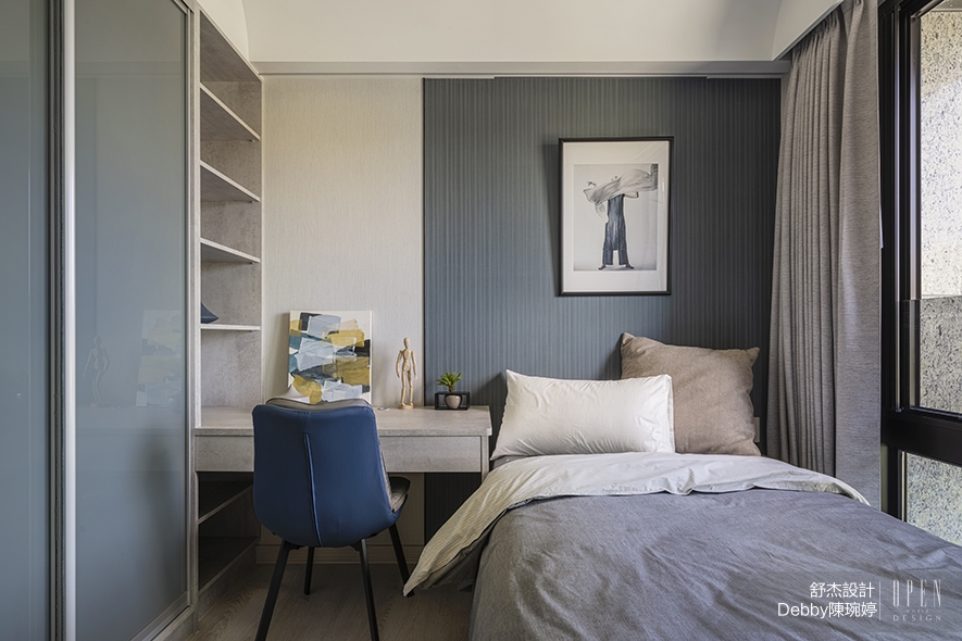 男、女孩房,依循使用者個性,做不同基底的表現;塑造奪目焦點的霓虹燈,與天花板可變色的LED燈,搭配圓鏡、收納展示架,妝點喜好美式的女孩空間,回應所屬使用者的獨特個人主張,讓繽紛的世界綻放於室;男孩房則運用灰藍色為主調,且將衣櫃表面做烤漆玻璃,便於小主人寫字塗鴉,供其充分發揮奇思異想。