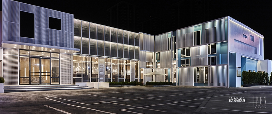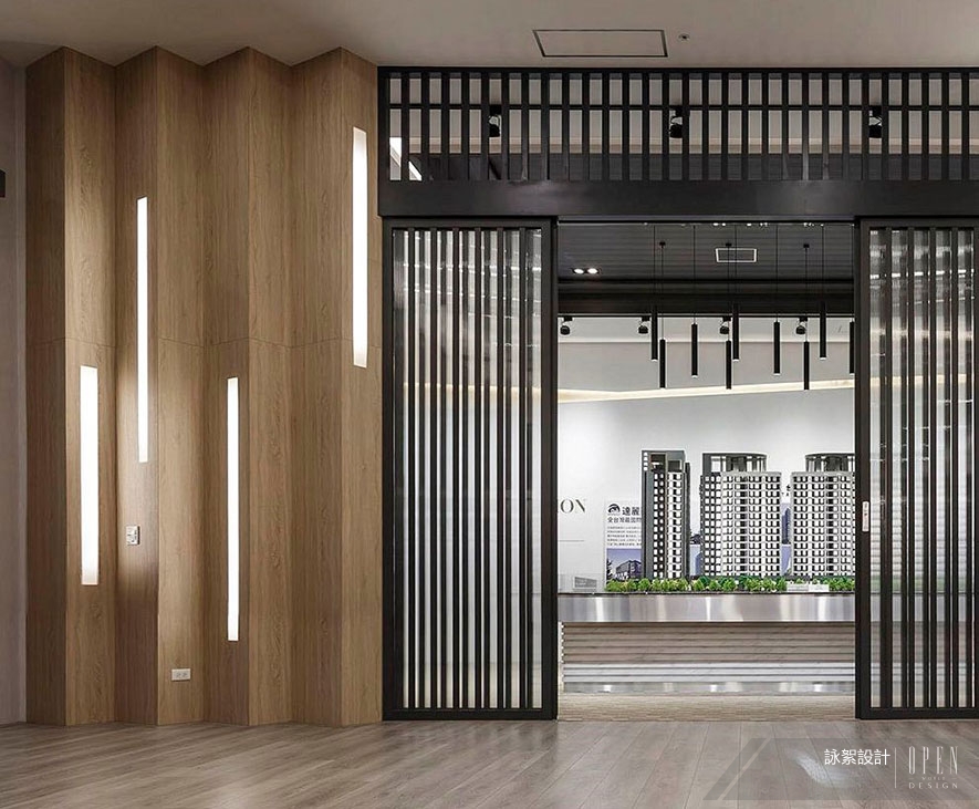 回應位處城市核心位置的建案,無論是外觀或是內部洽談、參觀區位的景緻,皆設以不同以往的造型:眾多線條組合夜間光線,暈染而成細緻的建物外貌、幾何塊狀形體的天花板、框體式座位隔屏⋯⋯,在訴說美感的同時,亦細心陪伴訪客體驗未來房屋的美妙。